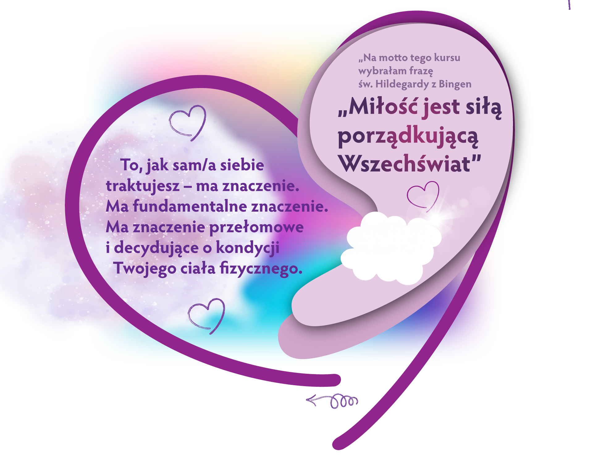 Uwaga! Ten kurs nie zastępuje leczenia konwencjonalnego ani terapii, choć może mieć działanie terapeutyczne. Nie stoi w sprzeczności z zabiegami i wytycznymi lekarza. Jest dodatkową formułą rozwoju świadomości i dbania o siebie. Jeśli ten kurs poruszy w Tobie coś, z czym trudno Ci będzie sobie poradzić – zgłoś się do terapeuty.